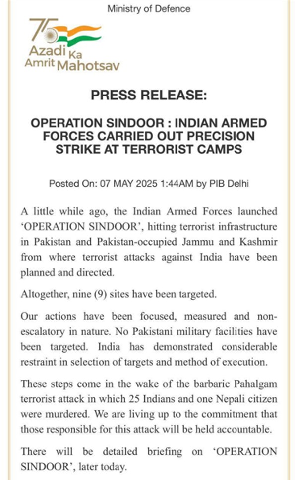 The Indian Ministry of Defence (MoD) issue a statement saying that the Indian Armed Forces launched Operation Sindoor, carrying out a series of precision strikes targeting nine terror targets, including terror camps and launchpads, in Pakistan and Pakistan-occupied Kashmir (PoK). The Ministry of Defence confirmed the strikes early Wednesday, calling them a “focused, measured and non-escalatory” response to the recent attack in Jammu and Kashmir’s Pahalgam, where terrorists brutally killed 26 civilians after identifying and segregating them.