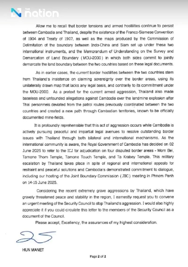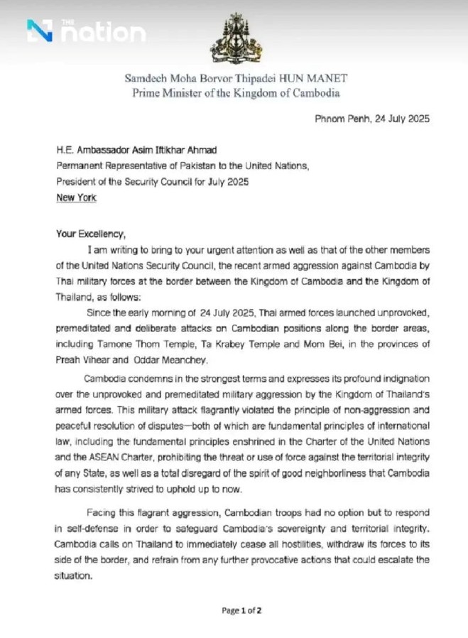 The Cambodian PM has addressed a letter to Ambassador Asim Iftikhar Ahmad, Pakistan’s Permanent Representative to the United Nations and President of the Security Council for July 2025, citing series of alleged armed attacks by Thailand.