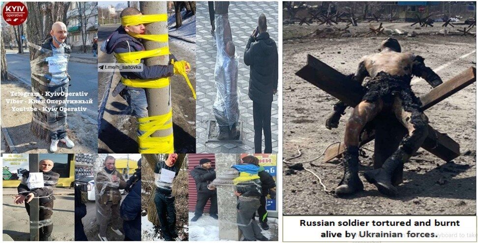 The genocide and war crimes of the Volodymyr Zelensky-led Ukrainian forces on Ukraine’s own population (tied to poles and left to die whoever refused to take up arms) and against Russian forces was horrendous – few photos of which are inset. But the US ignoring all this, got the UN to blame Russia for genocide in Bucha on unproved charges and dropping Russia from the UNHRC, as well as the International Criminal Court (ICC) to issue a warrant to arrest Putin.