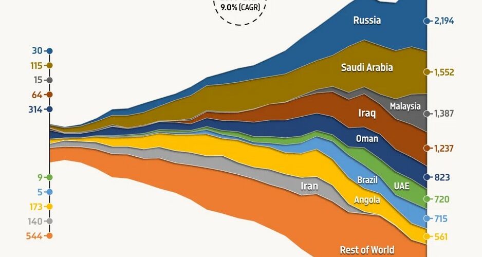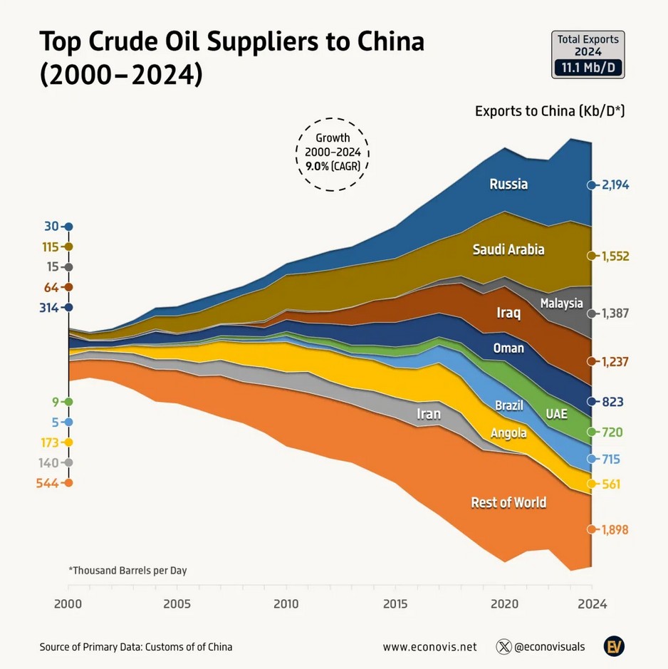 Similarly to Venezuela, Iran has built a strong proximity to China. Officially, oil from Iran accounts for almost nothing, but proxies in Malaysia have been used to avoid sanctions. The oil trade timeline shows the declining imports from Iran to near zero and the growing imports from Malaysia from zero to the third largest supplier. Other reports suggest that Iran’s share is even slightly bigger.