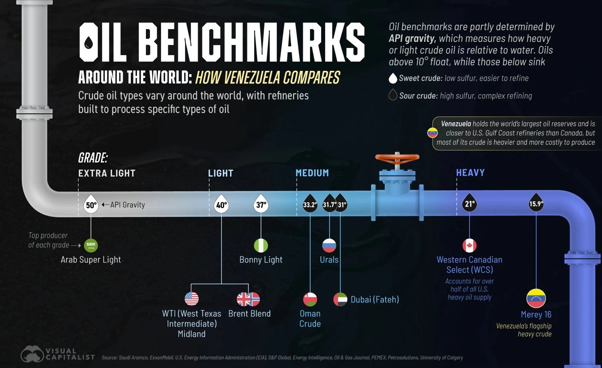 Earth extracted oils have API (American Petroleum Institute) gravity rating, which is a standard, inverse measure of petroleum liquid’s density relative to water, expressed in degrees. The formula is that API = (141.5 / (Specific Gravity at 60F)) – 131.5. As such, light oils are above 31.1 API, Medium oils are between 22.3 and 31.1 API, Heavy oils are between 10 and 22.3 API and Extra heavy (Bitumen) are less than 10 API. API gravity is essential for oil pricing and transportation. Light crudes flow easily, yield more gasoline and distillates, and clear global refineries with minimal processing, hence their higher prices. Heavy crudes, on the other hand, require dilution, complex upgrading, high capex (large investments to be able to process such crudes) and specific refinery compatibility (few of the existing refineries are able to process such crudes). Considering all this, even if Venezuelan oil is taken at a severe discount, the required oil price on the international markets, which make production economically feasible must be exceeding $60 per barrel.